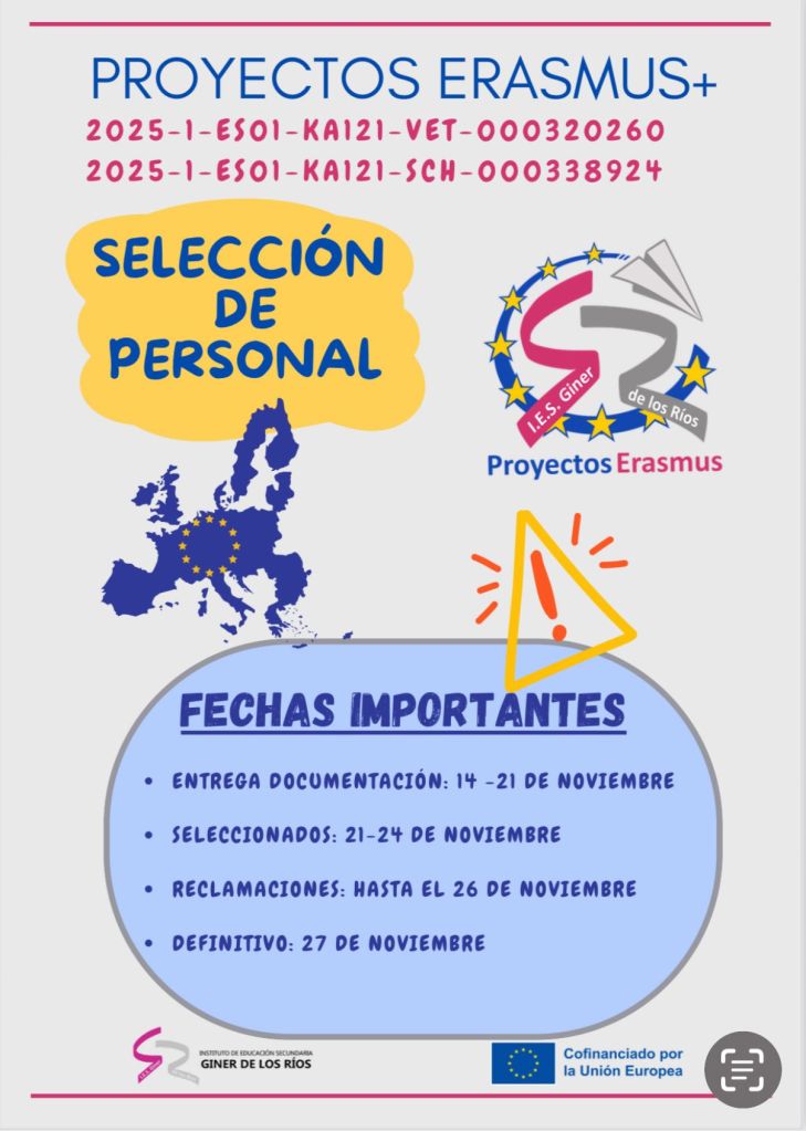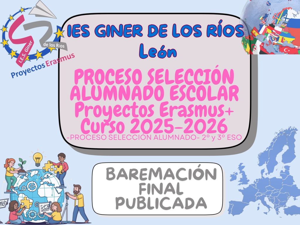 Reunida la Comisión de Selección establecida para la gestión del proyecto 2025-1-ES01-KA121-SCH-000338924 del I.E.S. Giner de los Ríos, León, en el curso escolar 2025/2026, la Comisión de Selección ACUERDA la resolución definitiva de la baremación de los participantes de movilidad de grupo escolar para el acceso a las diferentes actividades disponibles.